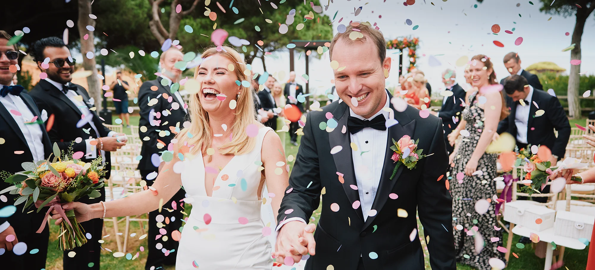 Bride and groom during the confetti walkout after the ceremony at Pine Cliffs Resort in the Algarve