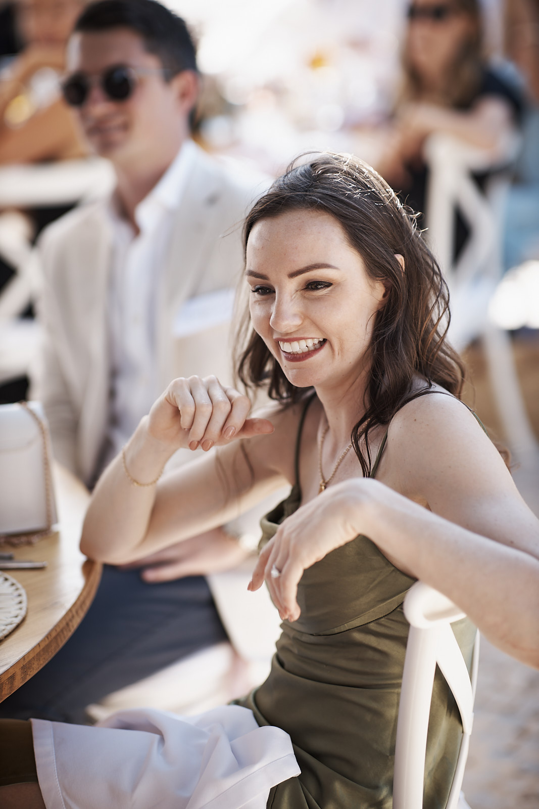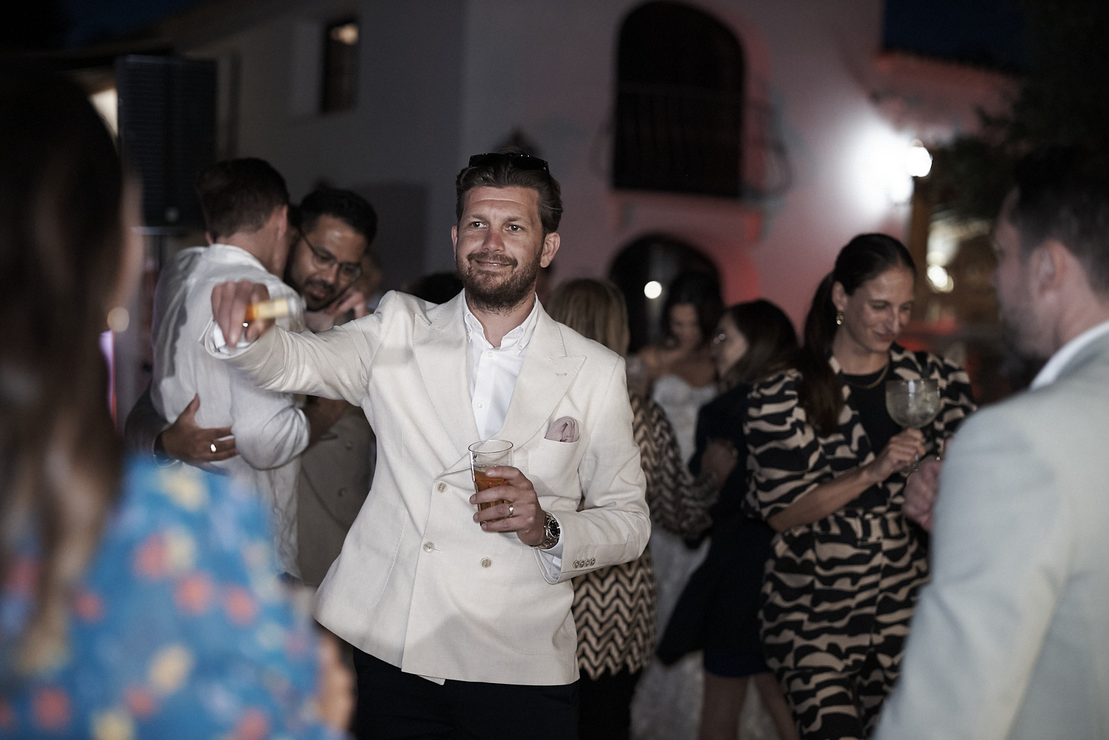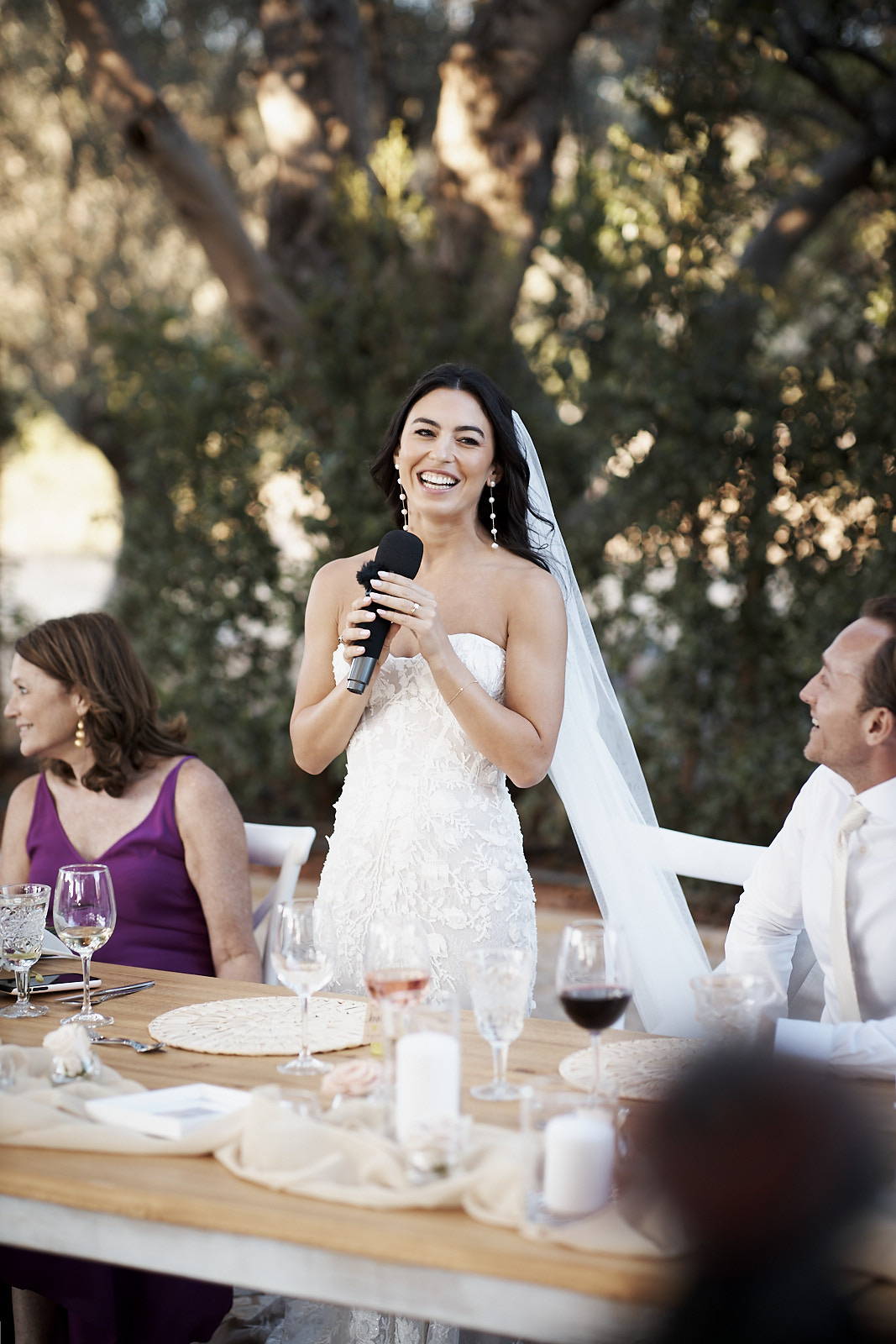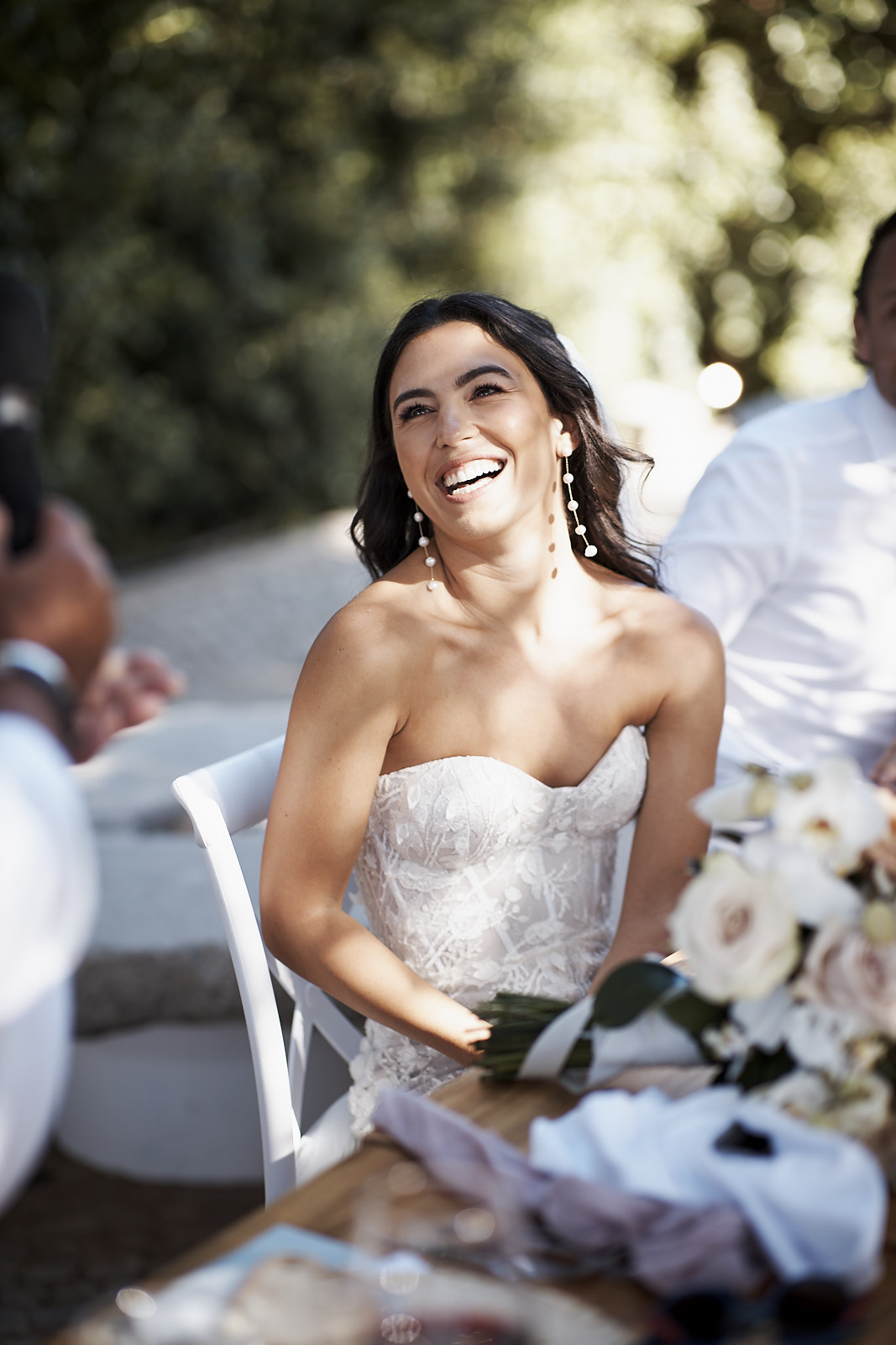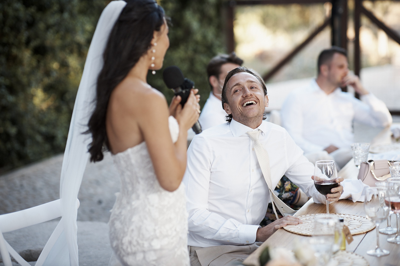 Auf die Cocktails am Pool folgte ein wunderschön gestaltetes Abendessen, bei dem cremefarbene Rosen und warme Holzelemente eine Atmosphäre schufen, die zugleich zeitlos, elegant und persönlich wirkte. Jeder Teil dieses Tages fühlte sich durchdacht an und ganz nach ihnen.