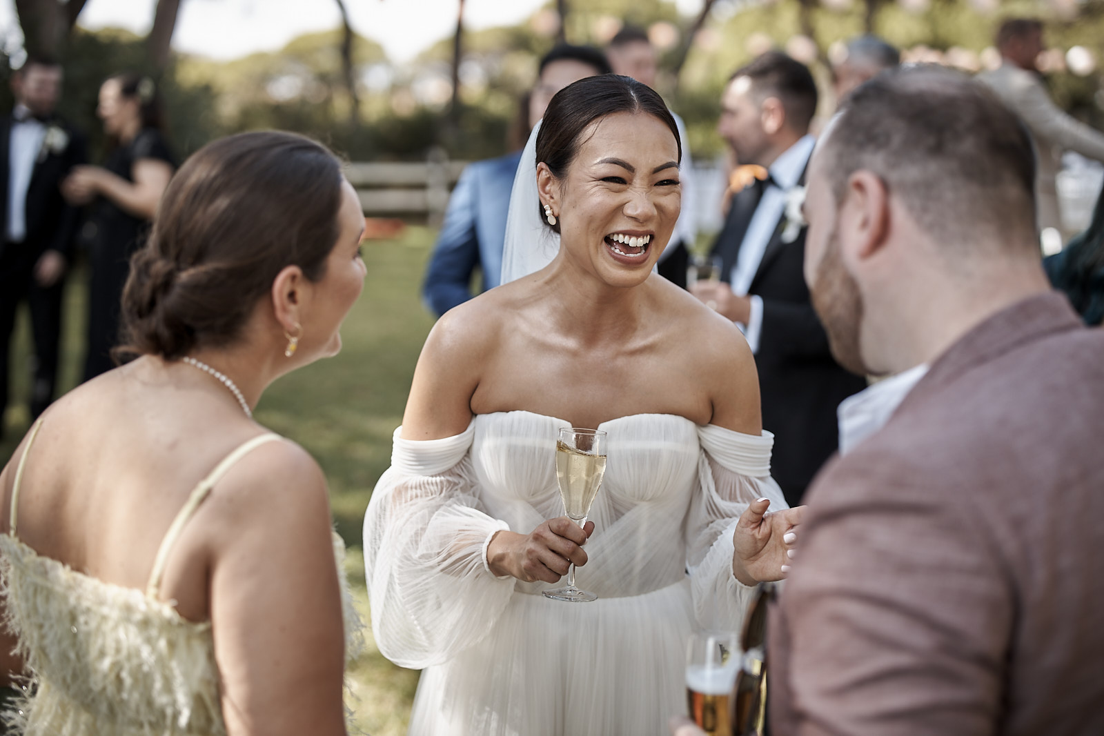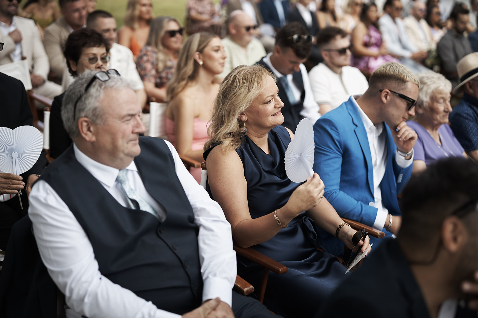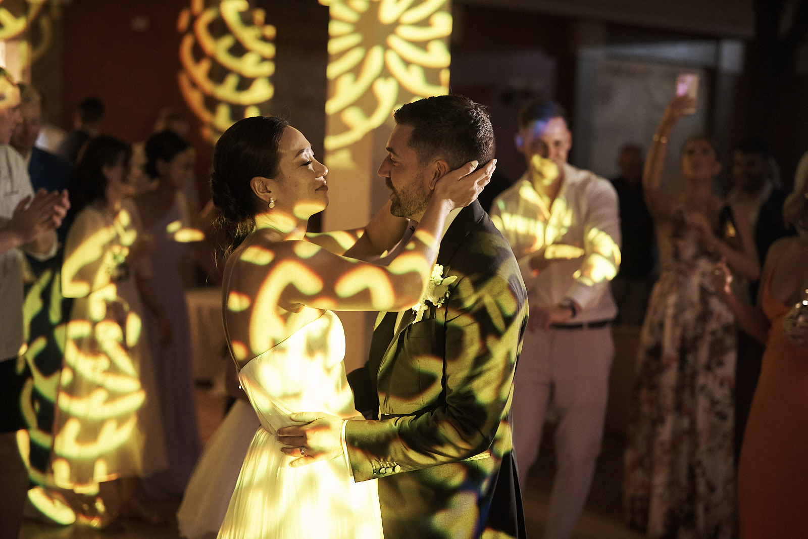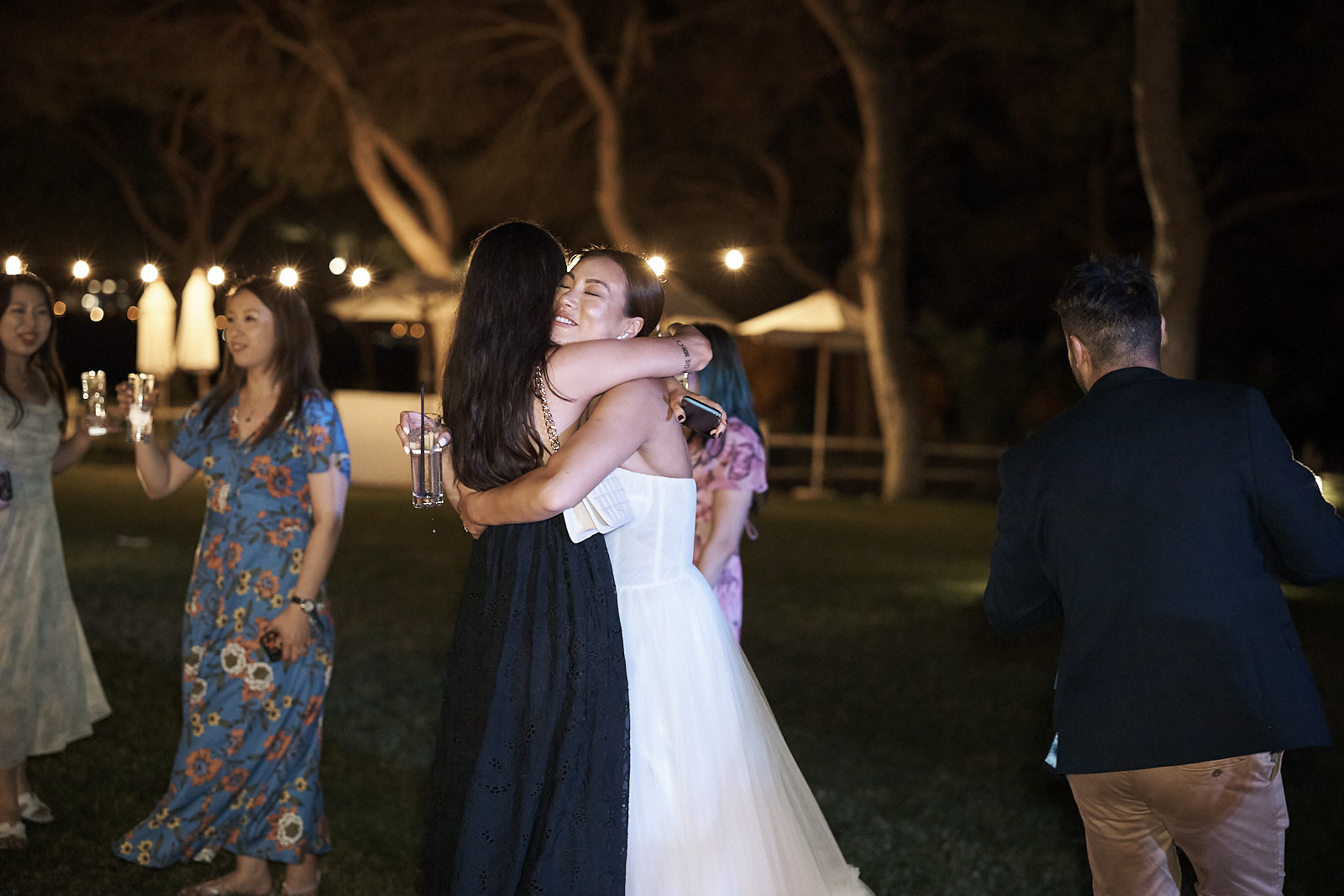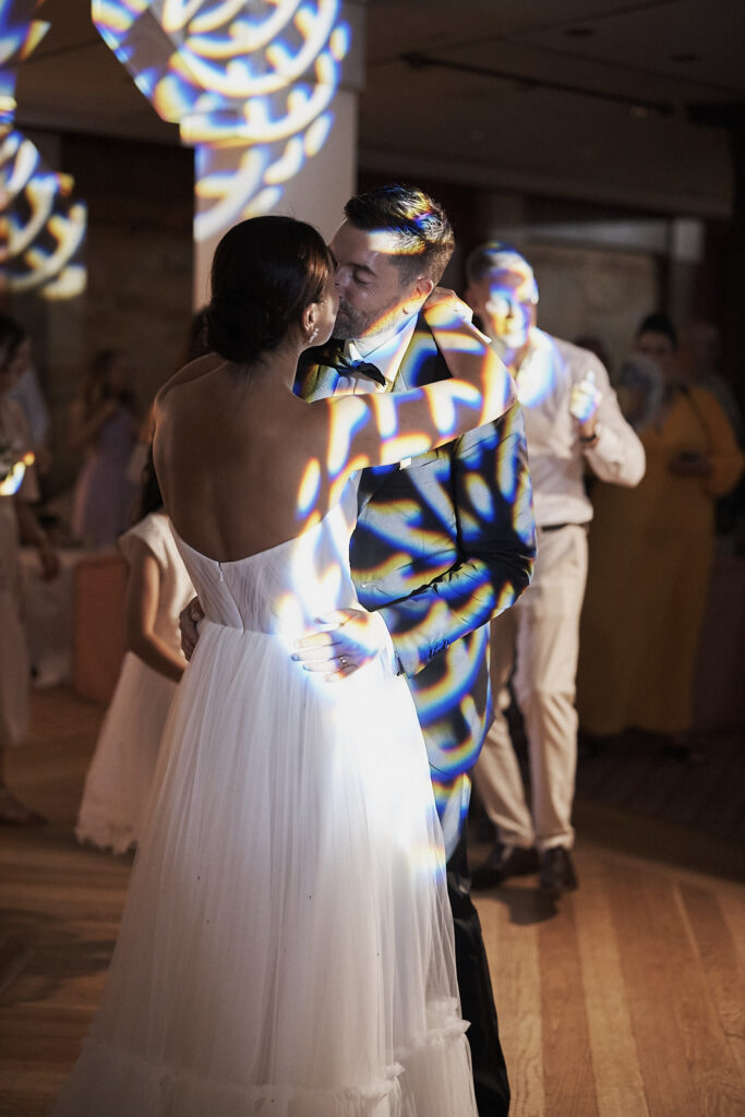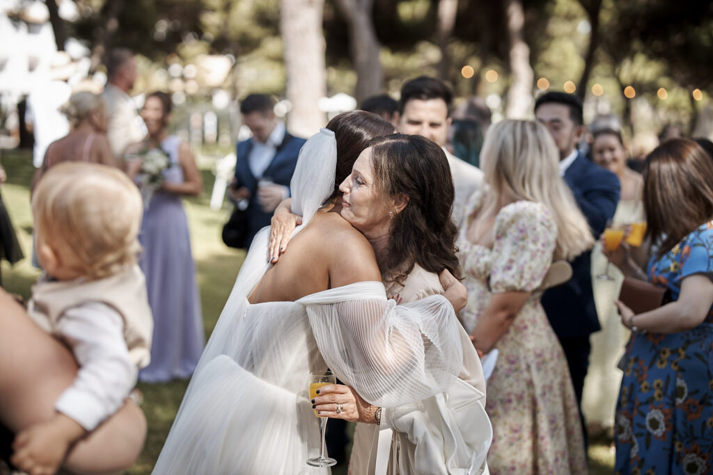 Auch der Empfang trug dieselbe warme und elegante Stimmung weiter. Umarmungen, echte Gespräche und das Abendlicht brachten zusätzliche Tiefe und Atmosphäre in die Bilder. Die Verbindung aus besonderer Umgebung und aufrichtigen Emotionen machte diese Hochzeitsreportage zugleich stilvoll und authentisch.
