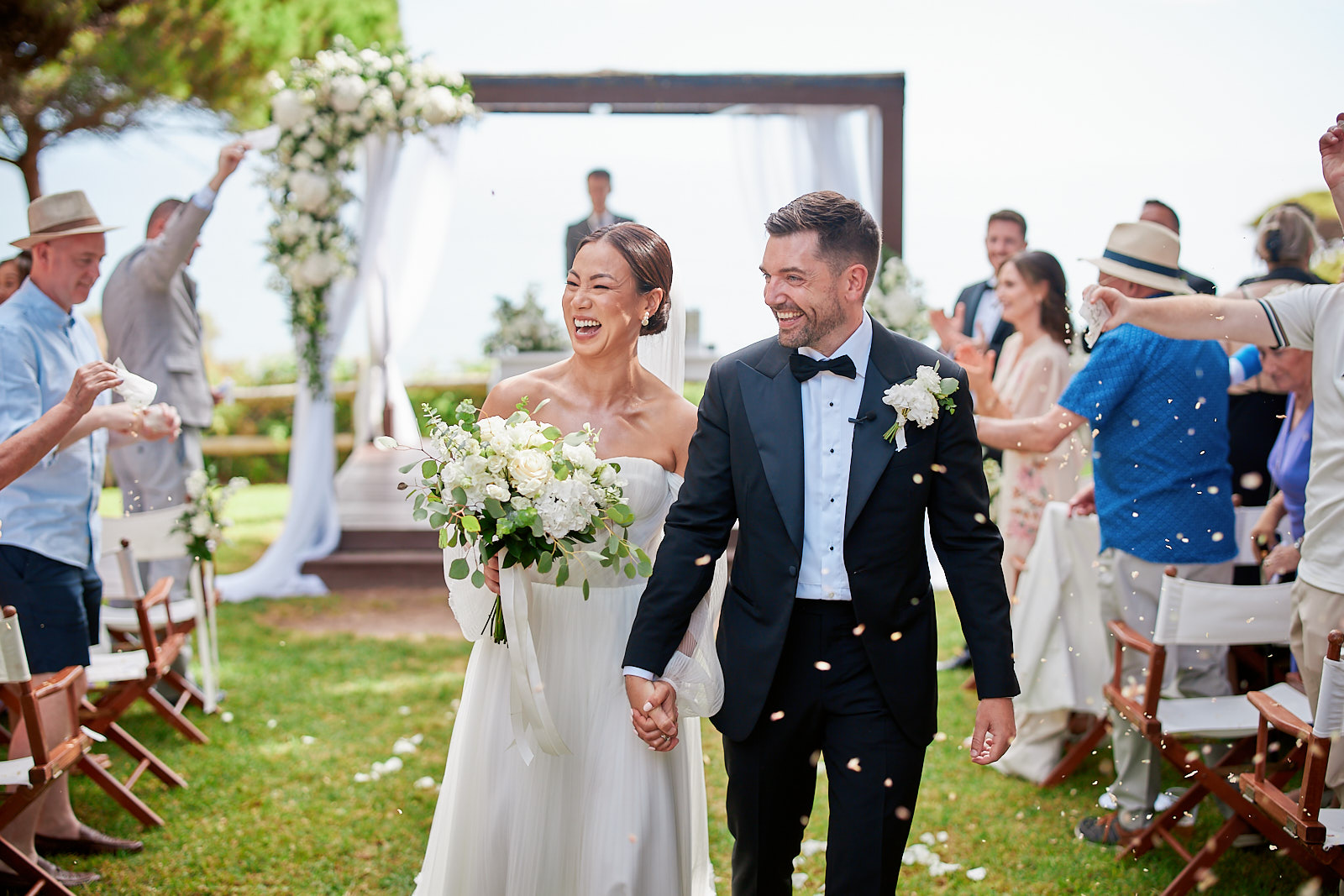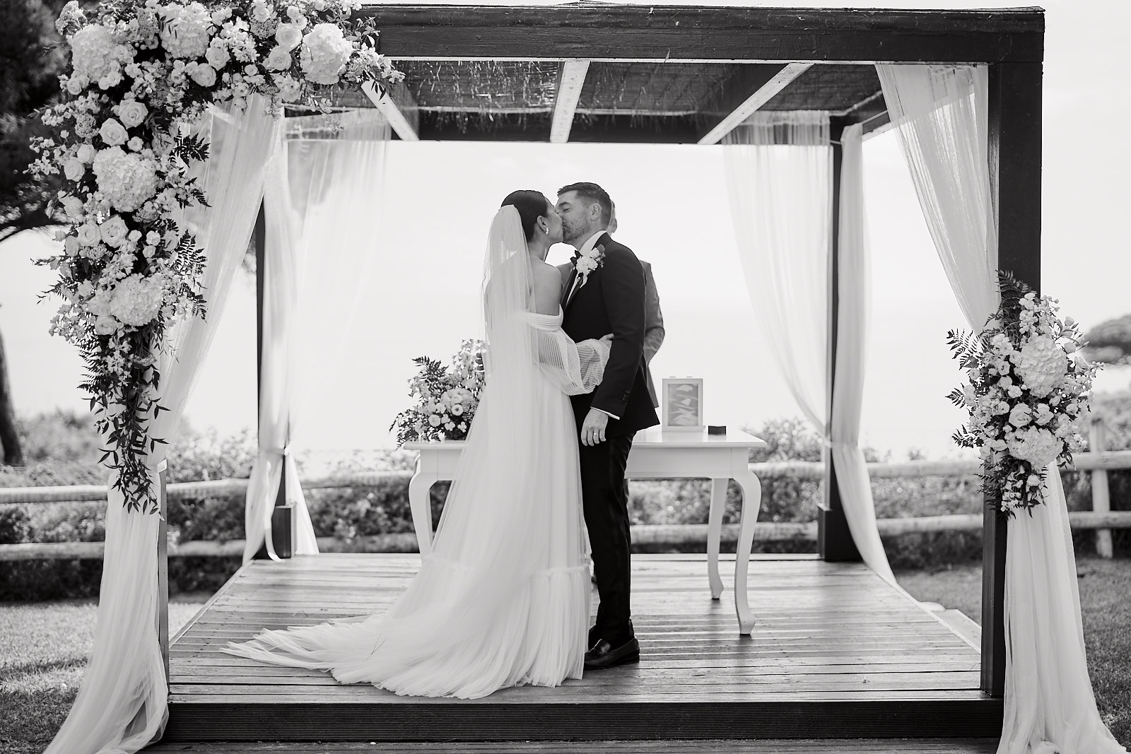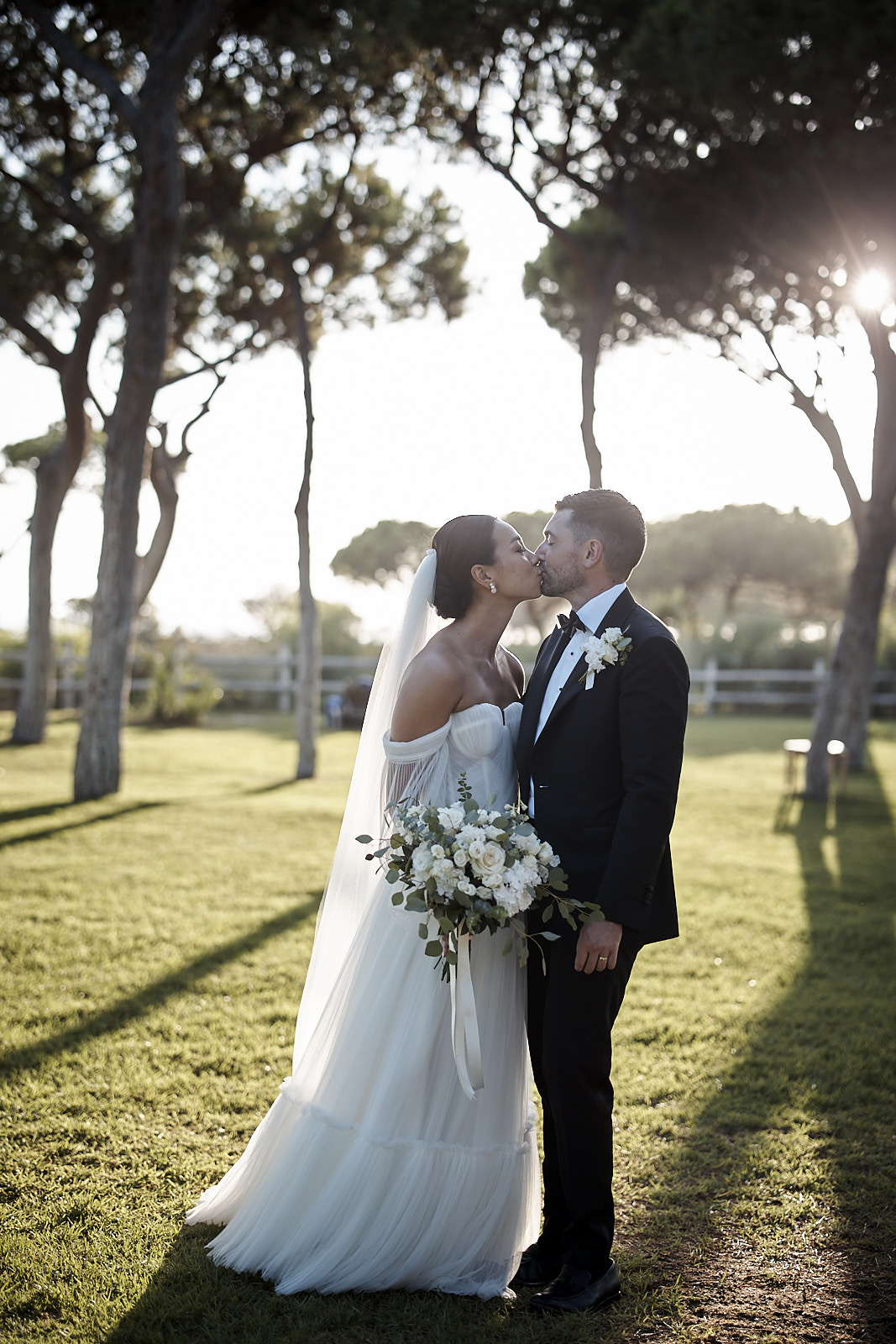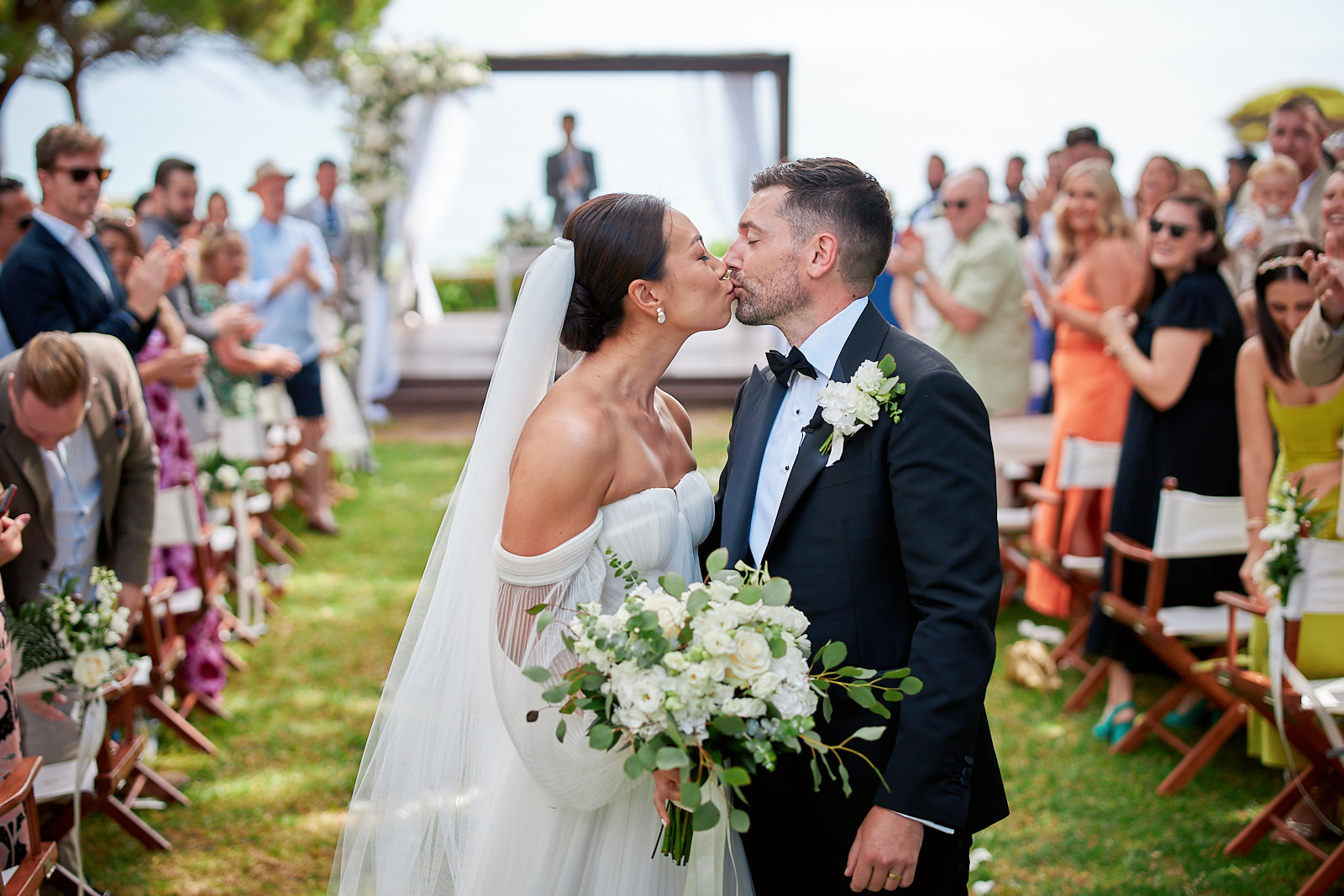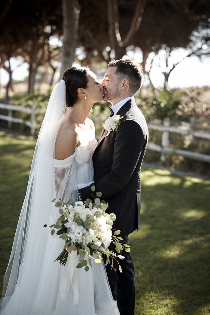 Brautpaar küsst sich nach der Trauung im Pine Cliffs Resort an der Algarve