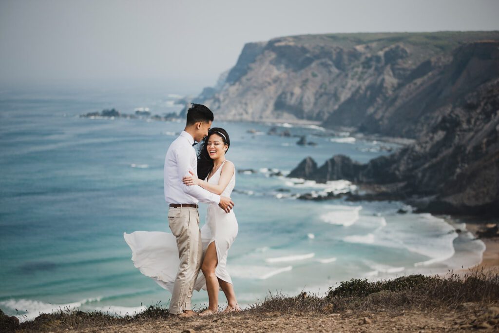 After the vows, we walked together along the cliff edges, capturing moments that felt unplanned yet timeless. The rugged beauty of the Algarve coastline — with its golden textures and expansive views — became a natural part of their story, enhancing each image with organic atmosphere rather than overpowering it.